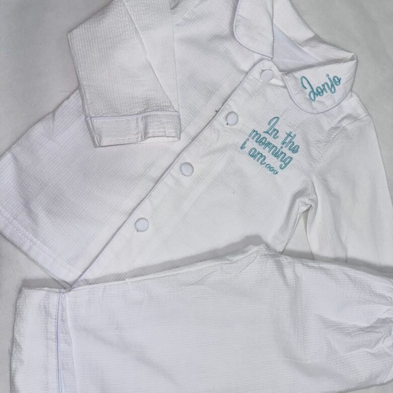 These pyjamas are personalised with “In the morning i am” and on the back their age with a carousel.